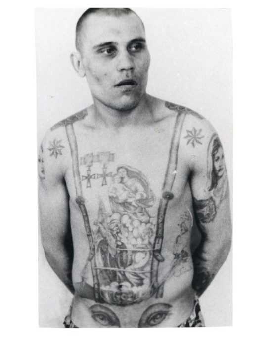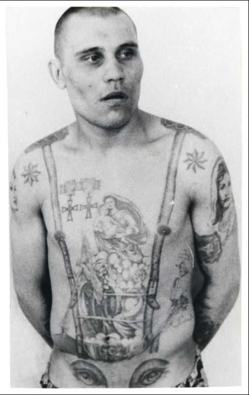 Череп и кости указывают на то, что заключенный отбывает пожизненное наказание. Одна восьмиконечная звезда означает, что он полуавторитет среди воров. Девочка, цепляющая платье удочкой, на левом предплечье, – татуировка хулиганов и насильников. Змея, свернувшаяся вокруг человеческих останков (на сгибе каждой руки) – вариант старой воровской татуировки. Змея – символ искушения, здесь же голову змеи заменила женская голова искусительницы. На правой стороне живота – версия «Юдифи» Джорджоне 1504 года: символ лукавой обольстительницы, предающей благородного человека.