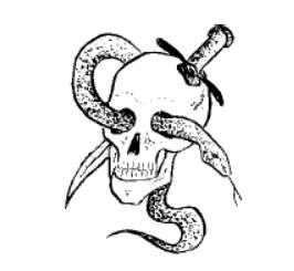 Череп и кинжал, наносят в районе груди, указывает на вора в законе или не однократно судимого зэка.