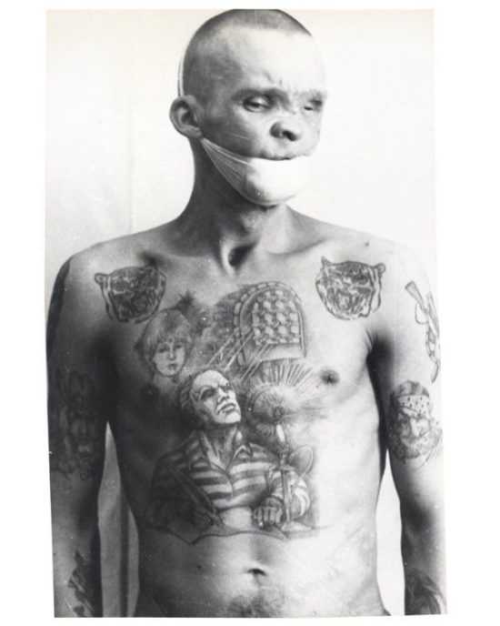 Этот заключенный – жертва сифилиса, болезнь оставила его лице, глазах и рту глубокие шрамы. В тюрьмах и колониях заключенные, и мужчины, и женщины, страдающие от венерических заболеваний (таких, как сифилис) называются «букетниками». Их также награждают армейскими чинами в зависимости от того, насколько тяжело состояние болезни. Например, «Колька таскался по бабам и не парился, вчера мне врач сказал, что он уже “лейтенант”» (заключенного, страдающего от сифилиса второй стадии, называют «полковником», третьей – «генералом»). Были случаи, когда люди заражались сифилисом, СПИДом и столбняком, когда им делали татуировки в антисанитарных тюремных условиях. Нанесение татуировок запрещено в тюрьмах и лагерях. Статус этой процедуры рос по мере того, как она становилась все более тайной из-за запретов и суровых наказаний со стороны администрации.