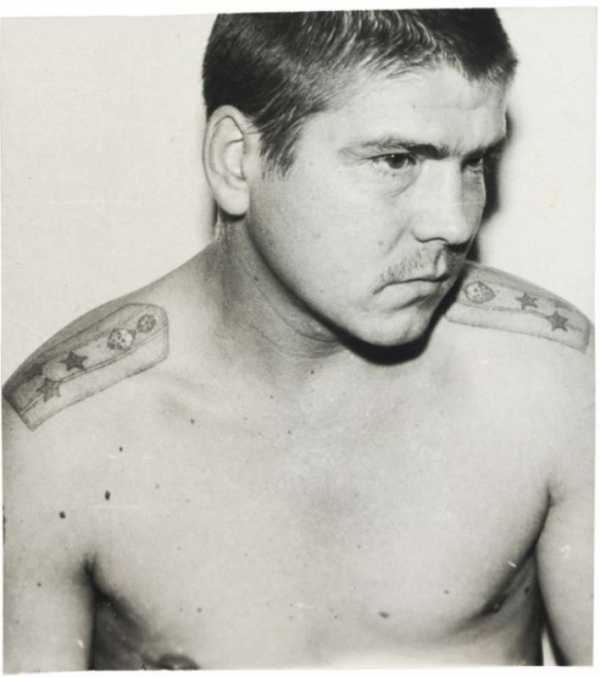 Звезды на плечах отмечают вора-авторитета. Роза на груди означает, что свое восемнадцатилетие он встретил в тюрьме. Для аббревиатуры SOS на правом предплечье есть несколько вариантов расшифровки: «Спасите от суда», «Спасаюсь от сук», «Спасаюсь от сифилиса», «Спаси, отец, сына», «Суки отняли свободу».