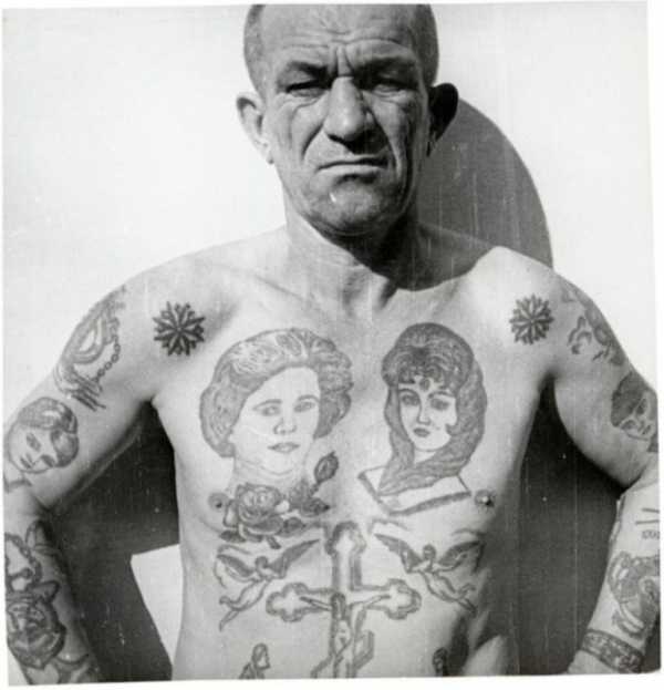 Старший эксперт-криминалист в Министерстве внутренних дел СССР по имени Аркадий Бронников за 30 лет своей службы собрал огромную коллекцию фотографий тюремных татуировок. Далее вы увидите расшифровку и описание тюремной символики, которую заключенные набивают на кожу в виде тату.На фото: обвивающая шею змея – знак того, что обладатель татуировки употребляет наркотики. Большинство заключенных – или алкоголики, или наркозависимые. Многие преступления они совершали в состоянии интоксикации. Звезды на ключицах и эполеты на плечах говорят о том, что перед нами авторитет. Штаны на заключенном – часть формы колонии особого режима, самого строгого режима заключения в Советском Союзе. Заключенные таких колоний называются особо опасными рецидивистами, на их счету могут быть такие тяжкие преступления, как педофилия. Они приговорены к более строгому содержанию под стражей, чем другие заключенные, и не могут быть освобождены условно-досрочно.