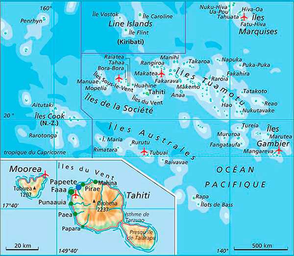 Многочисленные острова пяти архипелагов (слева — Таити и главный аэропорт Папеэте или Фааа)