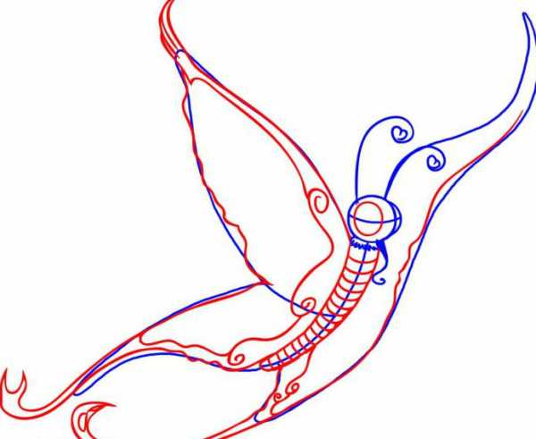 Из боковых линий предыдущего шага формируем переднюю пару крыльев — они более объёмные и крупные. После этого рисуем заднюю пару крыльев, значительно более коротких.