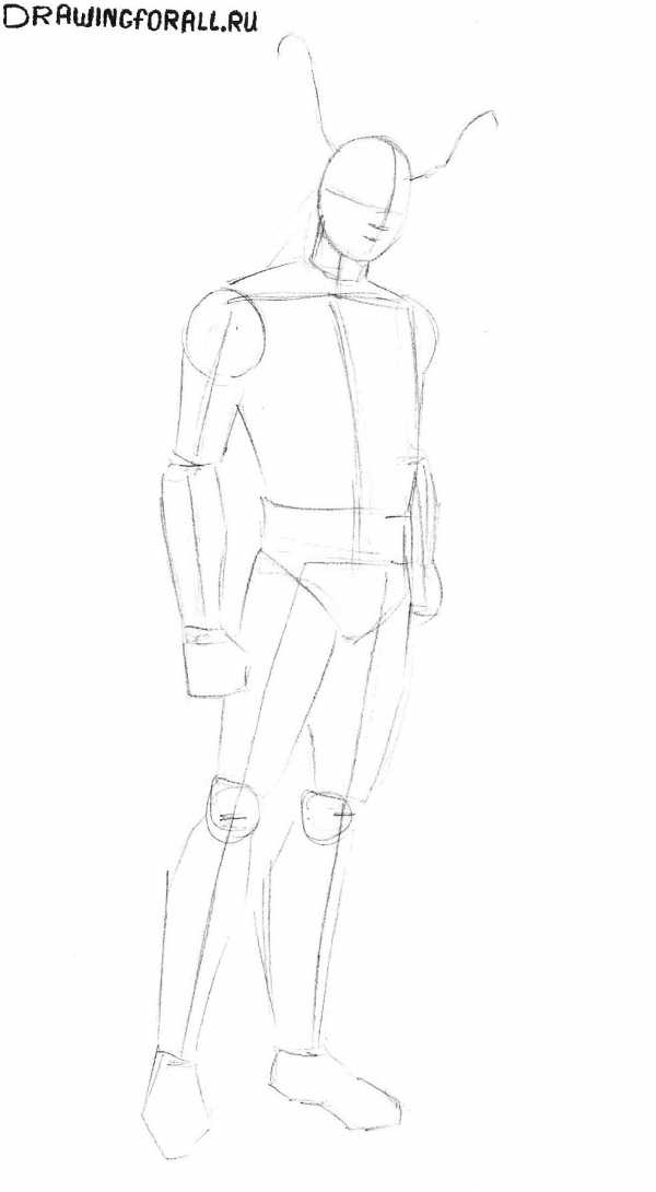 Когда будете рисовать ноги, не забудьте, что бедра сужаются по направлению от пояса к коленным суставам, и голени имеют характерную угловатую выпуклость за счёт мощных икроножных мышц. В завершении этапа наметьте ступни – они должны быть достаточно крупные и вытянутые за счёт массивной обуви.