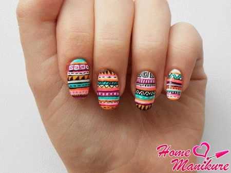 Яркий и смелый дизайн ногтей стал отражением традиций разных народов. Многое было позаимствовано у далекой жаркой Африки, но могут присутствовать элементы этноса разных стран. На орнаментах можно заметить русские и украинские мотивы, индейские, египетские, греческие, скандинавские и некоторые другие. Этнические рисунки вобрали в себя яркие краски, колорит и первобытный дух творчества наших предков.
