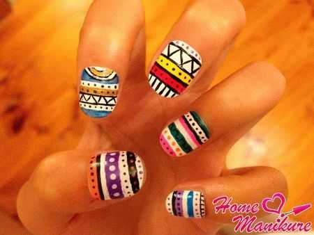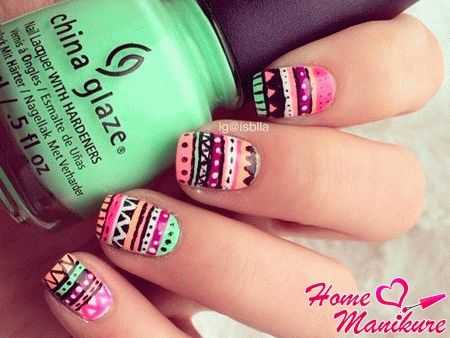 Tribal — это красиво, оригинальный дизайн супермодный, к тому же, его легко сделать своими руками, нейл-арт прекрасно согласуется с летней одеждой.