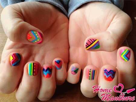 Если вам приглянулся такой маникюр, то рекомендуем запастись разноцветными лаками, чтобы отсутствие определенного оттенка не препятствовало осуществлению вашей задумки. Не забывайте, что черный цвет нужен обязательно – с его помощью придается четкость и контрастность рисунку .