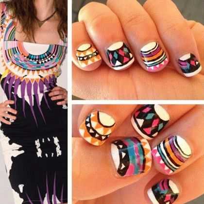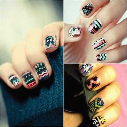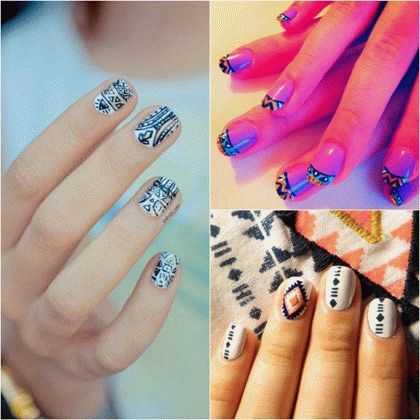 Одна из новейших модных тенденций в мире нейл-арта — ногти, украшенные этническими узорами, так называемый трайбл дизайн (tribal nail-art). В прошлом году он был в пастельных тонах и оттенках нуд. В этом году выбирайте яркие, летние, энергичные и красочные цвета лаков, такие как желтый, оранжевый, красный, бирюзовый, и, конечно, вам понадобится основной — черный цвет для создания самого узора.