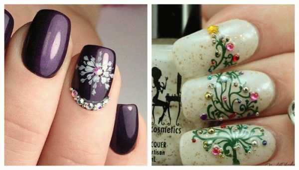 Если вы не хотите долго рисовать и выдумывать орнаменты, просто составьте рисунок из страз и камней разного диаметра, например в виде цветка, вензеля, короны и др. Стразы крепить очень легко, но подобный маникюр недолговечен и не всегда будет уместен в качестве повседневного варианта, это скорее праздничный дизайн.