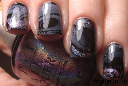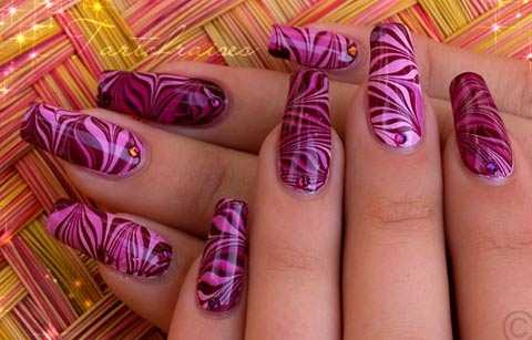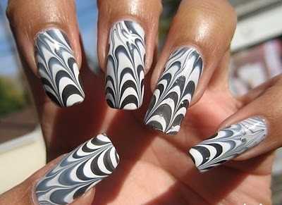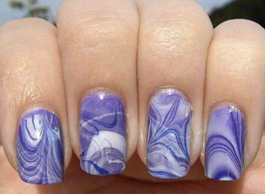 Мраморные ногти. Этот рисунок похож на мраморные разводы, которые можно сделать, используя специальную технику нанесения. Четкие детали прорисовывают гелевой ручкой. Перед тем, как выполнять данный дизайн, приготовьте необходимые инструменты: глубокую миску, немного воды, лаки нужных цветов.