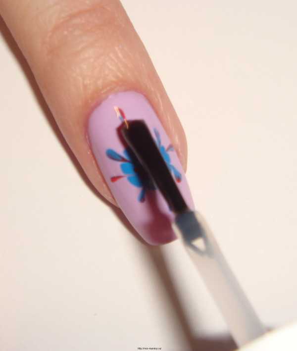 Не дожидаясь высыхания основного лака, поставьте в центре ногтя жирную точку лаком голубого цвета. Делать это нужно быстро, точным движением.