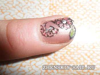 Теперь берем блесточки зеленого цвета и тоже разводим с лаком. Блестками рисуем лепесток. Даем немного высохнуть.