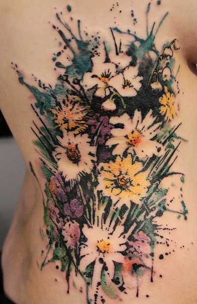Тату с изображением полевого цветка красиво будет смотреться на любой части тела – на ноге, запястье, руке, плече, спине и животе.