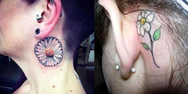 Тату ромашки на шее и за ухомЧуть больше и реалистичнее можно сделать тату на щиколотке, или запястье. А вот живот, спина и поясница – отличное «поле» для экспериментов с крупными рисунками. Хочется выделиться? Тогда сделайте лепестки ромашки вокруг пупка, а в центр – пирсинг с камнем, или стеклом ярко-жёлтого цвета.