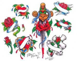 Это типичный образец олд скула. Смысл такой татуировки у каждого свой, в зависимости от того, какую надпись вы выберете для себя.