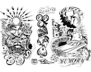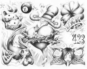 - Татуировка может совмещать в себе связанные между собой изображения или же наоборот — хаотичные рисунки, не имеющие никакой связи.