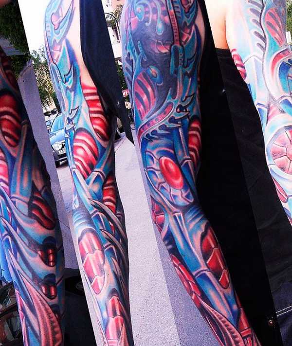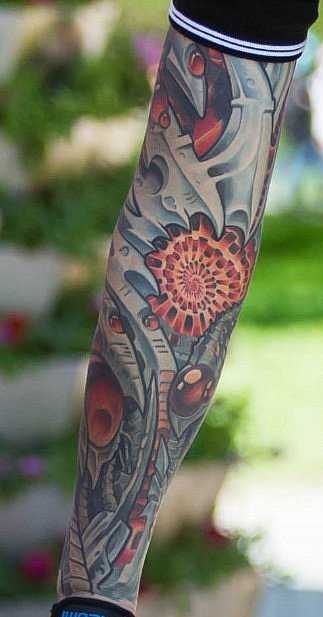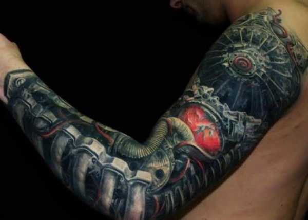 Этот стиль является одним из самых новых и в то же время популярных среди мужчин. Суть изображений – показать единство человека и машины, их слияние воедино. Направление появилось с выходом на экраны фантастических голливудских экшенов с киборгами, роботами, пришельцами в 80-х годах прошлого столетия. Идея создать иллюзию человека-робота настолько понравилась поклонникам нательной живописи, что именитые татуировщики рьяно кинулись усовершенствовать примитивные эскизы. Сегодня биомеханические эскизы выглядят как произведение искусства: металлические поршни, шестеренки, гайки настолько органично вплетены в человеческую плоть, что их сложно отличить от настоящих. Это стиль брутальных мужчин, стремящихся продемонстрировать внутреннюю силу, несгибаемость, стойкость и выдержку.