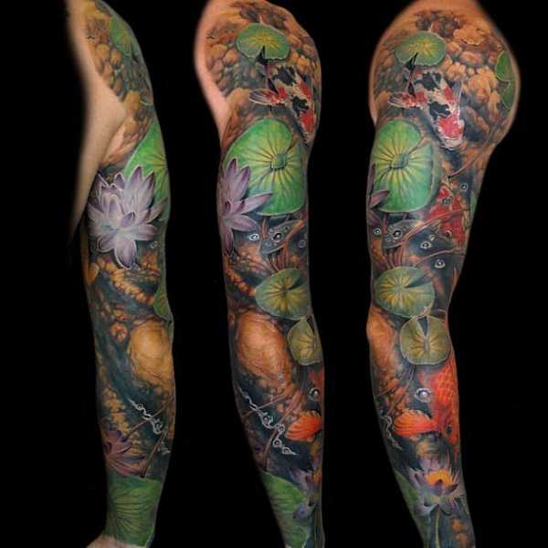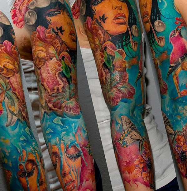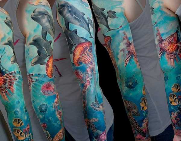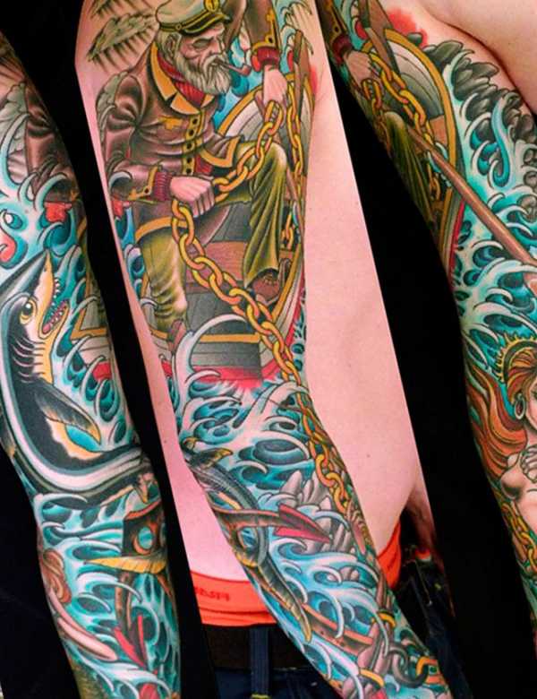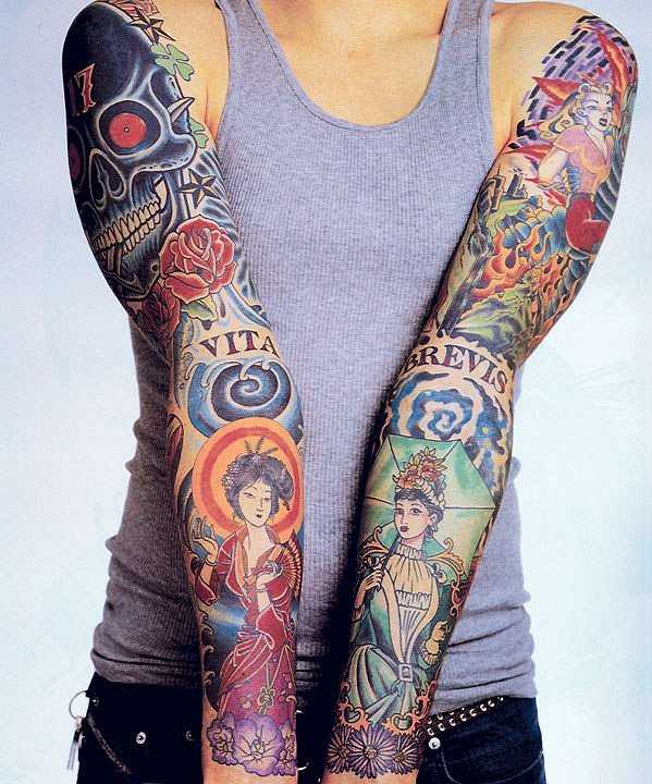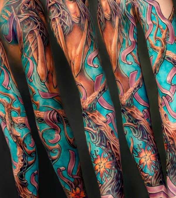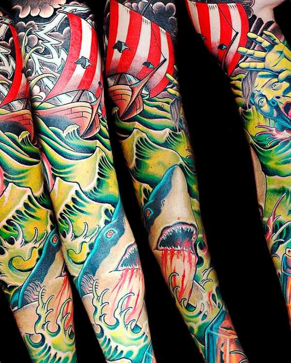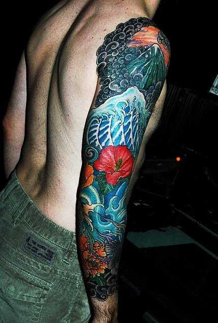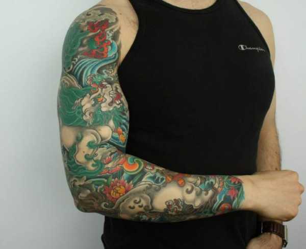 Татуировки-рукава считаются сложнейшими татуировками. Как правило, они делаются несколькими цветами, а в эскизе переплетается множество сюжетов, а фоном являются вода, вихри, пламя и т.д.