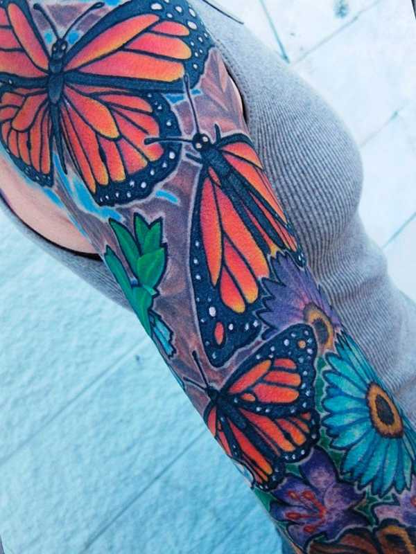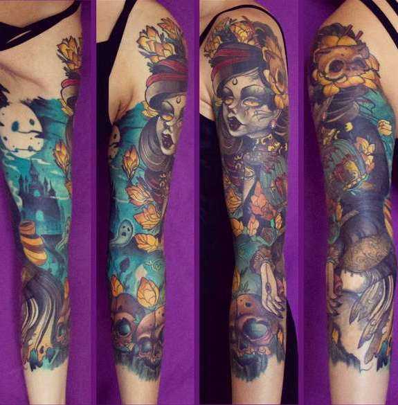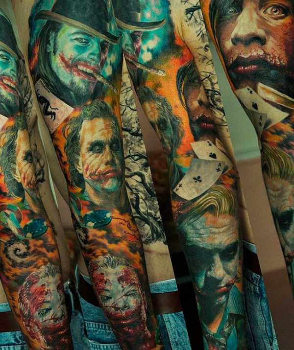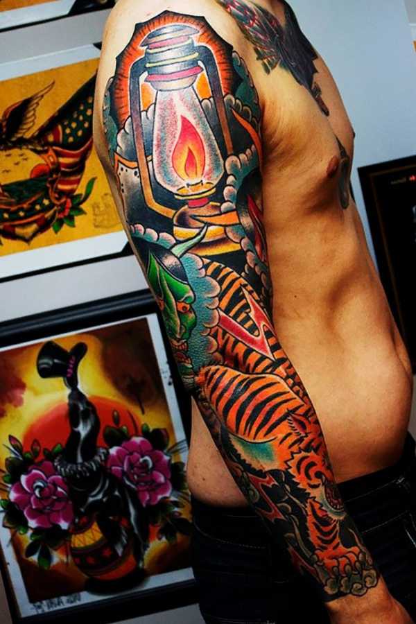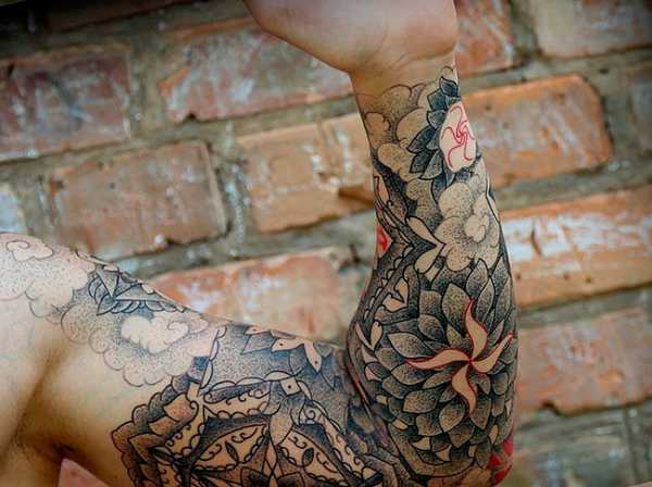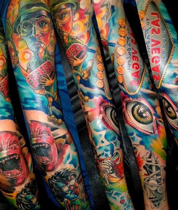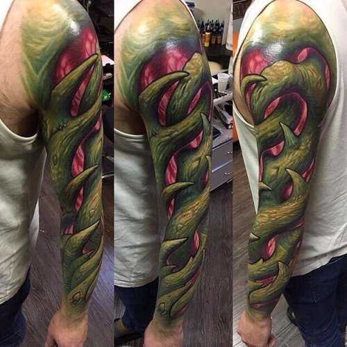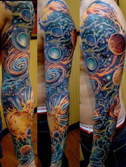 Татуировки-рукава считаются сложнейшими татуировками. Как правило, они делаются несколькими цветами, а в эскизе переплетается множество сюжетов, а фоном являются вода, вихри, пламя и т.д.