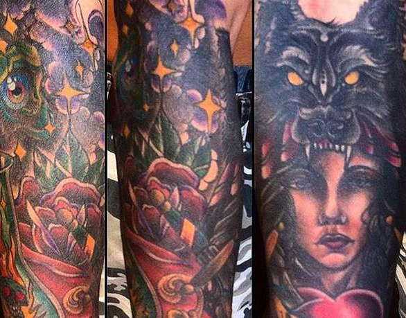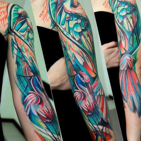 Часто можно встретить тату-рукав, на котором изображены разрозненные по смыслу тату. Скорее всего, это связано с тем, что хозяин вначале набил какой-то один участок на руке, а затем дорисовал, попытавшись объединить их.