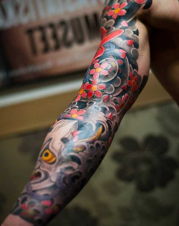 Стиль рисунков Страны восходящего солнца легко распознать среди других направлений: композиции очень пестрые, сложные, с большим количеством мелких деталей. Один из наиболее распространенных образов для мужчин – карп кои. Он обладает ярко выраженной мужской энергетикой, наделяет владельца смелостью, решительностью, привлекает в жизнь богатство. Считается, что чем больше изображение карпа – тем больше разбогатеет обладатель тату-рукава.