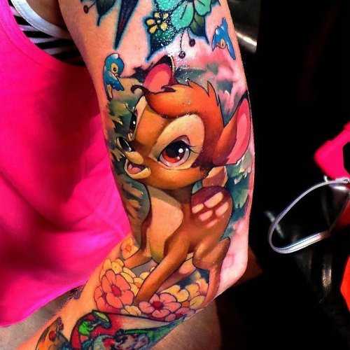 Такие татуировки делаются яркими, с большим количеством ярких красок, часто добавляют в композицию ярко-голобую воду и оттенки оранжевого и золотого.
