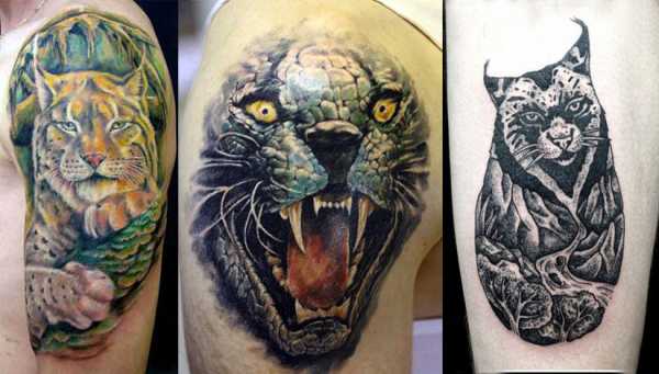 Три изображения рыси 1) на охоте. 2) рысь абстракция. 3) рысь сюрреализм.Для некоторых посетителей тату салонов значение имеет не смысл их будущих татуировок, а их внешний вид, и то, как рисунок будет сочетаться с уже имеющими. Эта задача не так проста, как может показаться. Поэтому важно, чтобы исполнитель был профессионалом. Тогда он придумает, какой размер и стиль использовать, чтобы добиться гармонии.