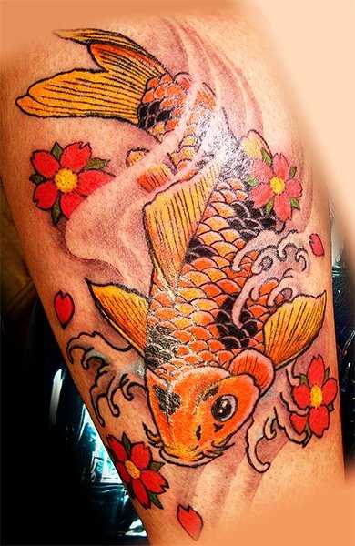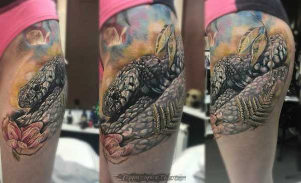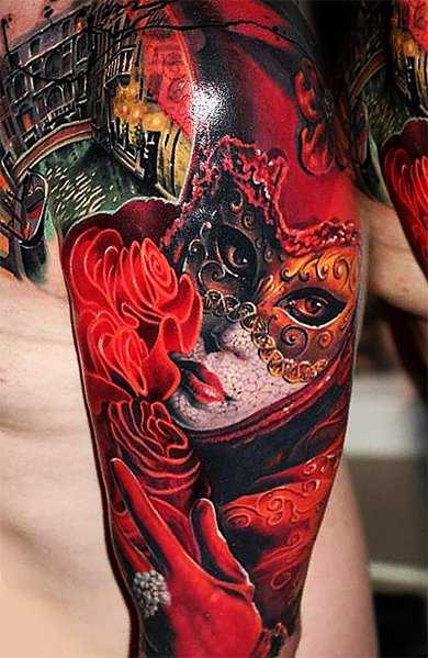 На теле женщины бедро является одной из идеальных частей для размещения масштабной татуировки. Мастер может использовать дополнительные возможности объема.