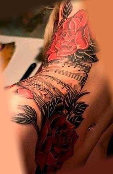 Татуировка череп и ноты с розами выполнены профессиональным тату-мастером