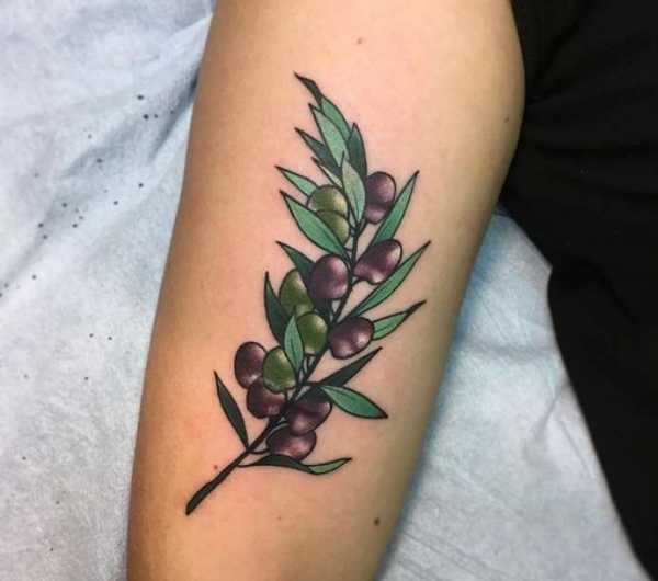 Татуировка с изображением оливковой ветви означает благополучие, богатство, плодородие, умиротворение. Также она олицетворяет стойкость, выносливость, способность переносить тяготы и не удачи и при этом не быть сломленным духом.
