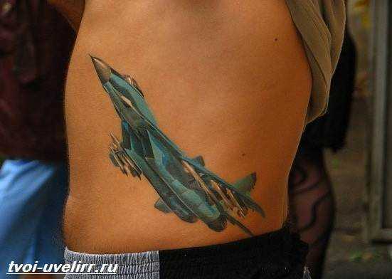Что означает тату «Самолет» на мужском теле понять, как правило, несложно. Представители сильного пола предпочитают картины с конкретными моделями летательных аппаратов.