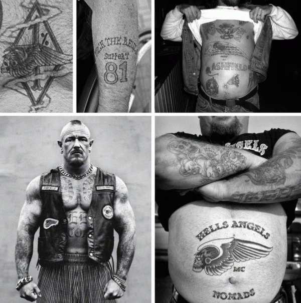 Знак байкеров — это «голова смерти» (копия с 552-й бомбардировочной эскадрильи Второй мировой). Также вместо головы колят прописные буквы «hell’s angels», «HA», «81» или иногда «AFFA» — Angel Forever Forever Angel.