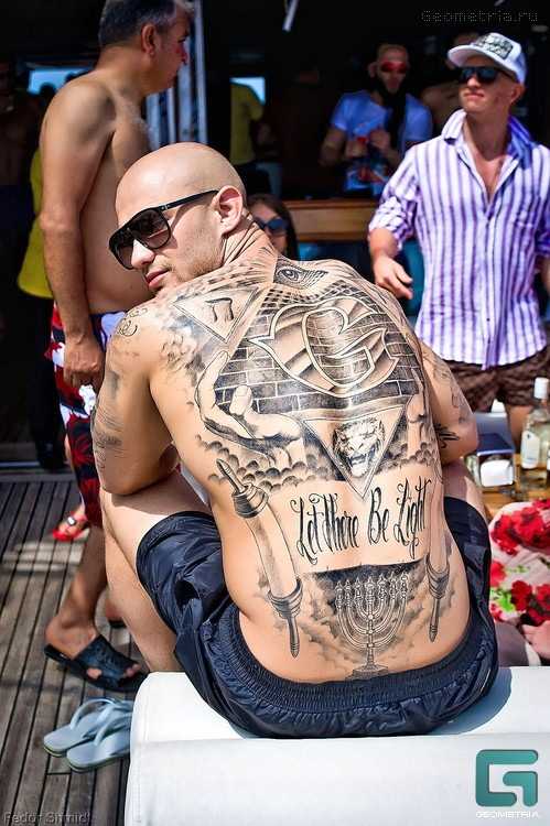 Всю спину занимают татуировки в виде атрибутов иудейской культур. В районе шеи набит глаз в треугольнике – всевидящее око. Ниже: большая буква G – первая буква имени, затем свиток с надписью, которая переводится как «Да будет свет».