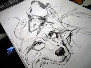 При поиске эскиза в индейском стиле учитывайте, что изображение волка хорошо дополнят ловец снов, луна, цветы или крылья. Интересно выглядит голова животного с плавным переходом в голову вождя в обрамлении полагающейся по статусу шапки из перьев.