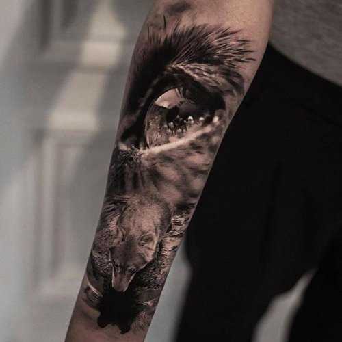 - Опека и защита – еще одна символика хищника. Многие легенды гласят, что зверь помогает страждущим и обессиленным людям. Он понимает, когда и в чем человек нуждается. Одно поверье гласит, что обнищавшему старику животное подарило волосок с брови. Скитаясь по свету, человек попросился на ночлег, но с помощью подарка разглядел в хозяйке дома опасность и ушел. Видимо, потому тату глаз волка символизирует проницательность, считается зеркалом души и предостережением.
