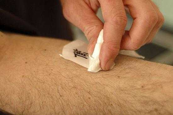 - Наклейка освобождается от пленки и располагается на области тела, куда будет наносится, после чего хорошо смачивается водой.