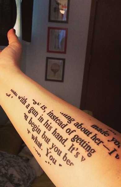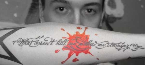 Татуировка в виде цитаты, поговорки или устойчивого выражения очень популярны в наши дни. Люди, которые желают оставить на себе заметный чернильный след, могут быть совершенно непохожими друг на друга, например, стремящийся что-то доказать этому миру подросток, девушка, которой хочется привлечь с себе повышенное внимание, пожилой рокер на пенсии, для которого очередное тату – это просто часть огромной коллекции, голливудская звезда, которая хочет запомниться поклонникам еще с одной стороны.