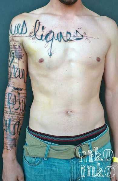 Представители же сильного пола, склоняются к сдержанности и классике исполнения. Они выбирают преимущественно печатный минималистский стиль. Мужские татуировки-надписи имеют чаще угловатую форму, с заостренными буквами. Цвет мужчины предпочитают стандартный – черный или темно-синий.