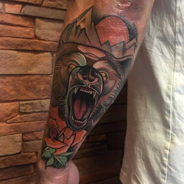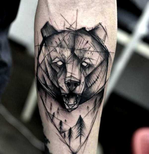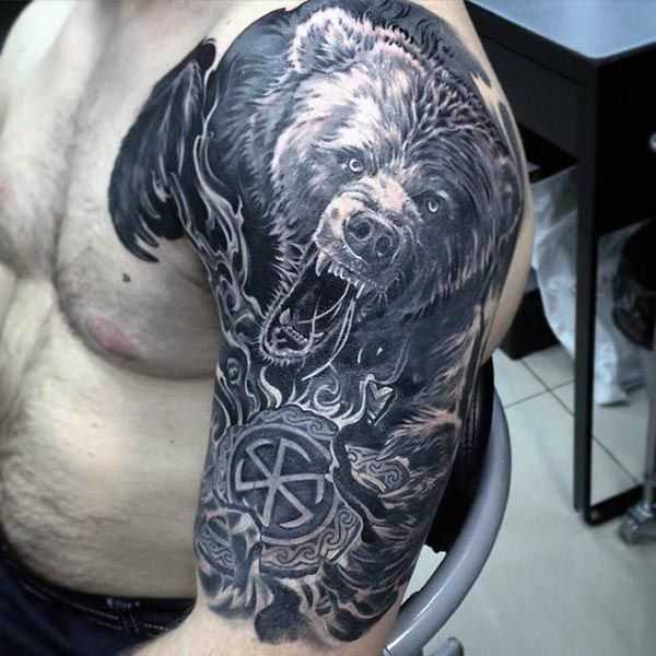 Эскизы и фото тату медведей для мужчин на руке, ноге, спине, груди, плече и даже рукава с медведем. Оскал медведья, голова, медведь в лесу и тд. Значение медведя в сфере тату: мощь, власть и стойкость, решительность и смелость, способность нести мир и добро.