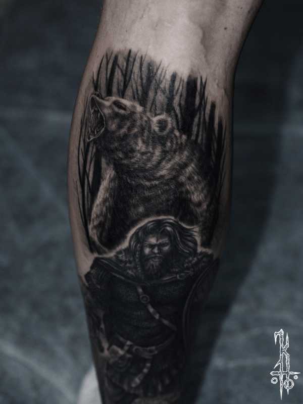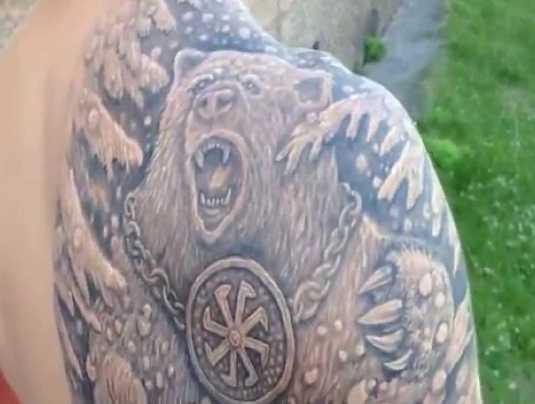 Берсеркеры были бесстрашны, отличались быстрой реакцией и носили шкуры медведей. Это символ скандинавского Бога Одина. Его нередко изображали в образе косолапого. Берсеркеры служили Одину. Поэтому, с одной стороны тату «Медведь» — эскиз с намеком на веру в силу и могущество Бога. С другой же стороны, наколка говорит о буйстве и даже неадекватности.