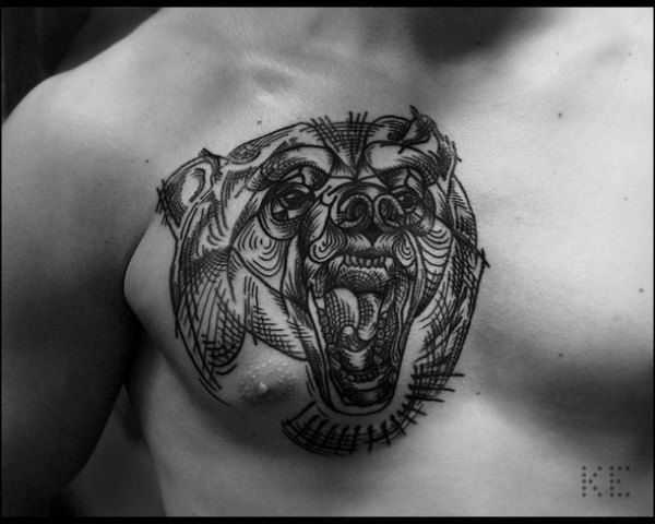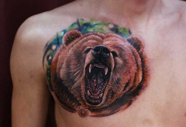 Размещение тату медведя на груди играет ту же роль, что и на спине, только здесь она еще заметнее. К тому же такой выразительный рисунок прекрасно подчеркивает выпуклые и объемные грудные мышцы.