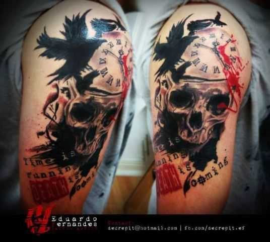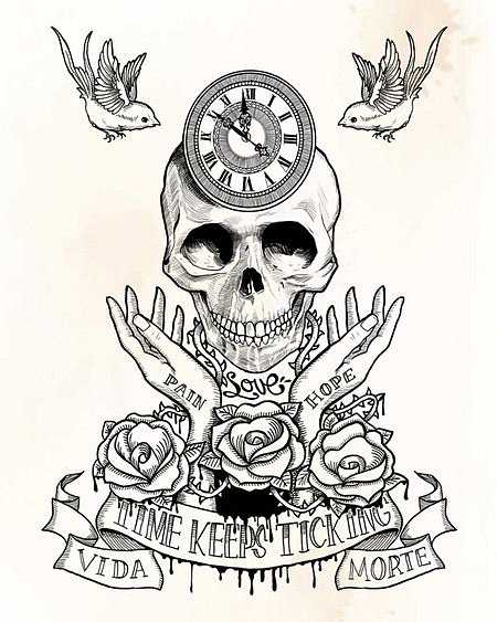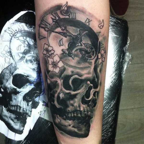 Тату черепа и часовОтдавать предпочтение стоит личным представлениям о смерти. В зависимости от манеры исполнения, тату будет защитой от негатива. Хорошо смотрятся тату в стиле: