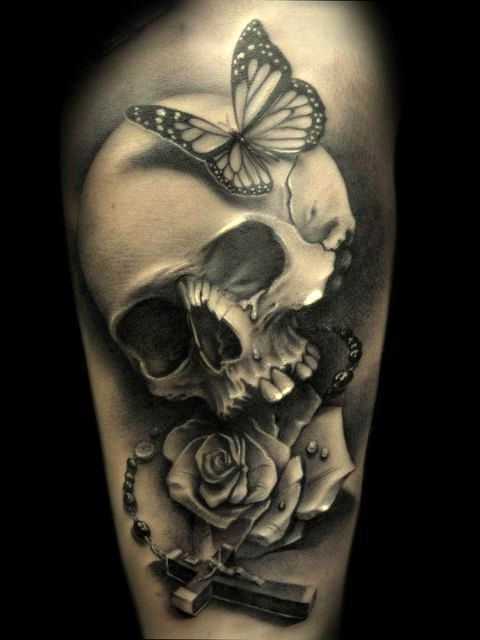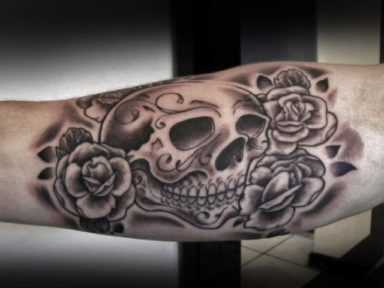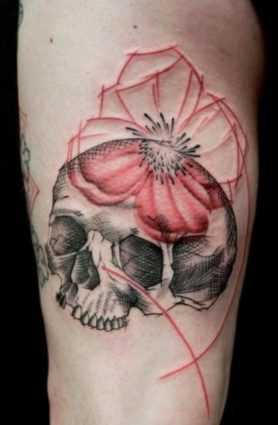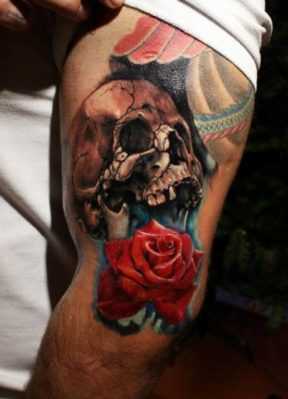 Сейчас тату череп может быть в особом единении с другими изображениями-символами, обладая при этом индивидуальным смыслом. Ярким примером может служить интересное соединение в рисунке черепа и розы, тем самым показывается зависимость друг от друга смерти и любви.
