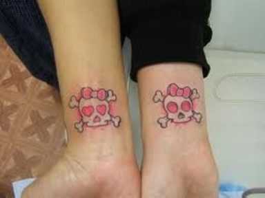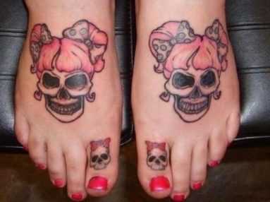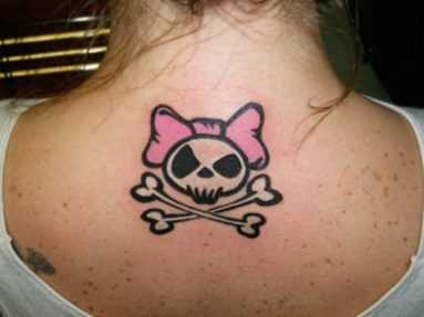 Девушки чаще всего больше придаются фантазии в работе над будущей татуировкой. Создавая женскую татуировку, используются самые разнообразные цветовые решения, выбирая всяческие дополнения в виде цветов или других элементов-символов. Выбор места нанесения рисунка на теле также может быть различным, начиная от мест наиболее открытых – плечи, область груди, спина, позволяющая создавать большое поле рисунка, и заканчивая другими, менее доступными местами. Достаточно эффектно татуировки с изображением черепа смотрятся на бедре или голени.