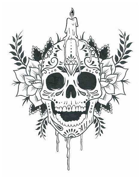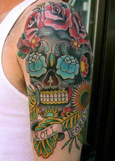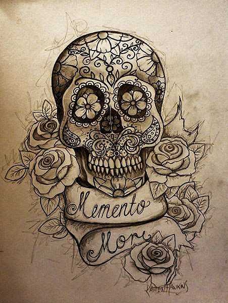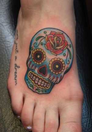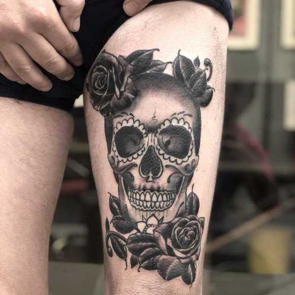 Из популярных трактовок, значение череп и роза подсказывает, что для человека важна страсть и любовь. Тату сахарный череп или калавера (calavera —«череп») показывает страстную натуру, которая живет полной жизнью.