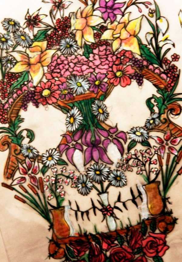 Очень часто девушки оставляют традиционные темные оттенки нарисованного черепа, придавая ему женственных ноток, украшают добавлением красных вьющихся цветков. Непревзойденное сочетание красного и черного цветов никого не оставит равнодушным, соединяя в себе, благодаря красному цвету, страсть, а в черном цвете, в свою очередь, отражая некую печаль.