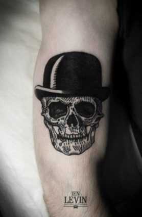 Череп – очень распространённый сюжет для татуировки. Изображение черепа, иногда со скрещёнными костями, впервые было использовано пиратами ещё между 18-19 веками и носило устрашающую функцию.