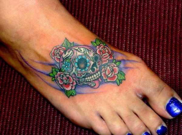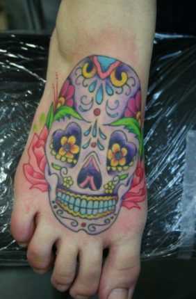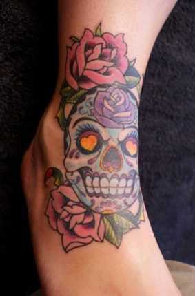 - Если форма черепа продолговатая с вьющимися цветами, стоит обратить внимание на зону стоп, голени, рук. Тату на руке череп может быть представлена в различной цветовой гамме, с дополнительными узорами.