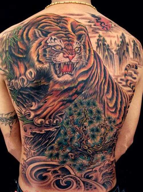 Если татуировка тигра на спине содержит открытую пасть и вытянутую лапу с когтями, это может означать агрессивный характер хозяина. Такое изображение удобней всего сделать именно на спине или груди, так как рисунок должен быть объемным.