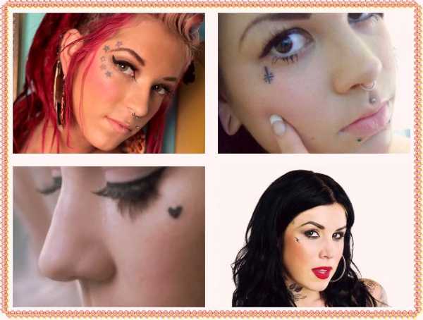 И также стоит хорошенько обдумать и расположение тату под глазом: посередине, у внешнего или внутреннего уголка. Чаще всего склоняются ко второму варианту. Во-первых, на этом месте изображение смотрится наиболее выигрышно, а во-вторых, кожа здесь не такая нежная и чувствительная, как у внутреннего уголка.